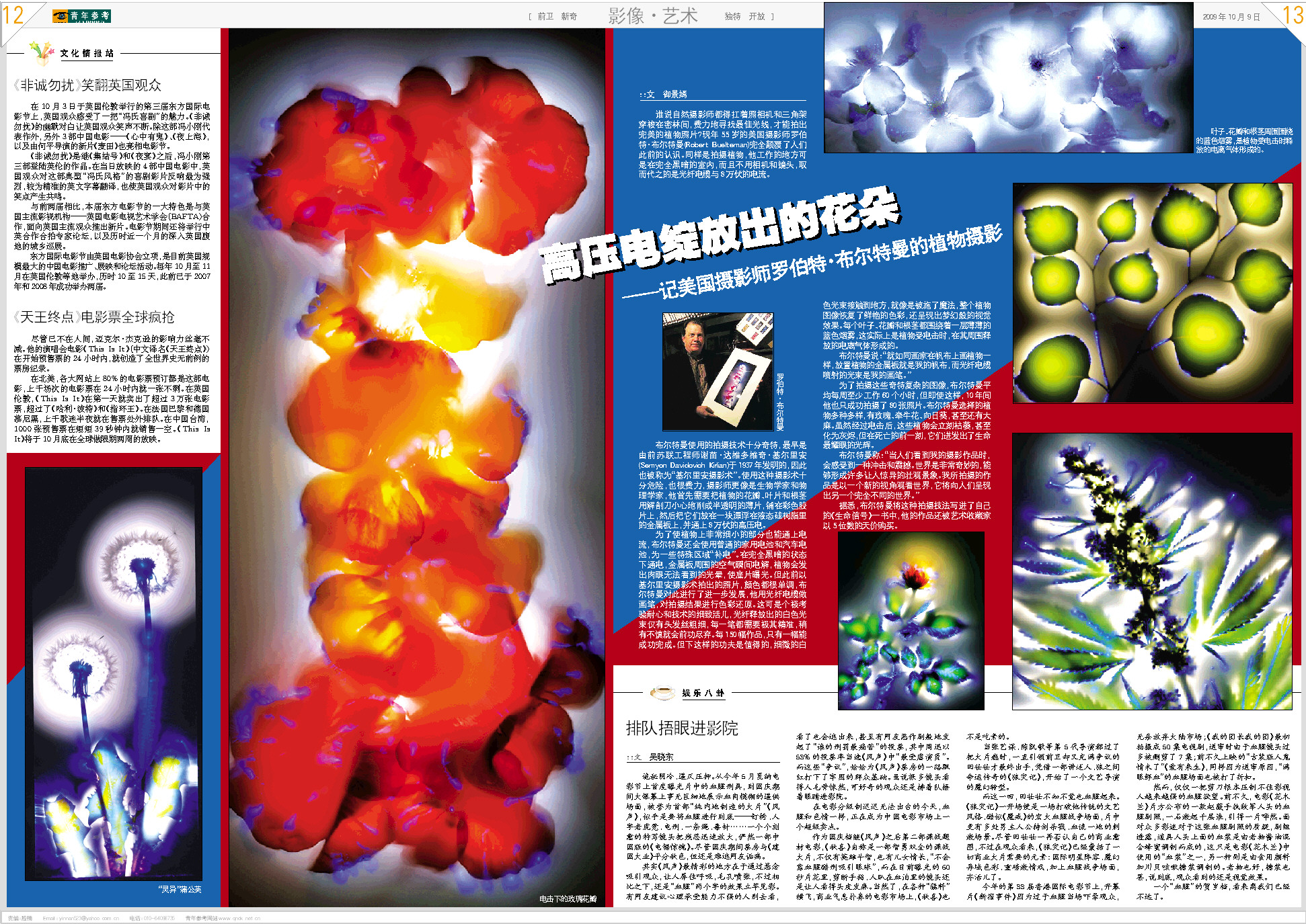 谁说自然摄影师都得扛着照相机和三角架穿梭在密林间,费力地寻找最佳光线,才能拍出完美的植物照片?现年55岁的美国摄影师罗伯特·布尔特曼(Robert Buelteman)完全颠覆了人们此前的认识。同样是拍摄植物,他工作的地方可是在完全黑暗的室内,而且不用相机和镜头,取而代之的是光纤电缆与8万伏的电流。