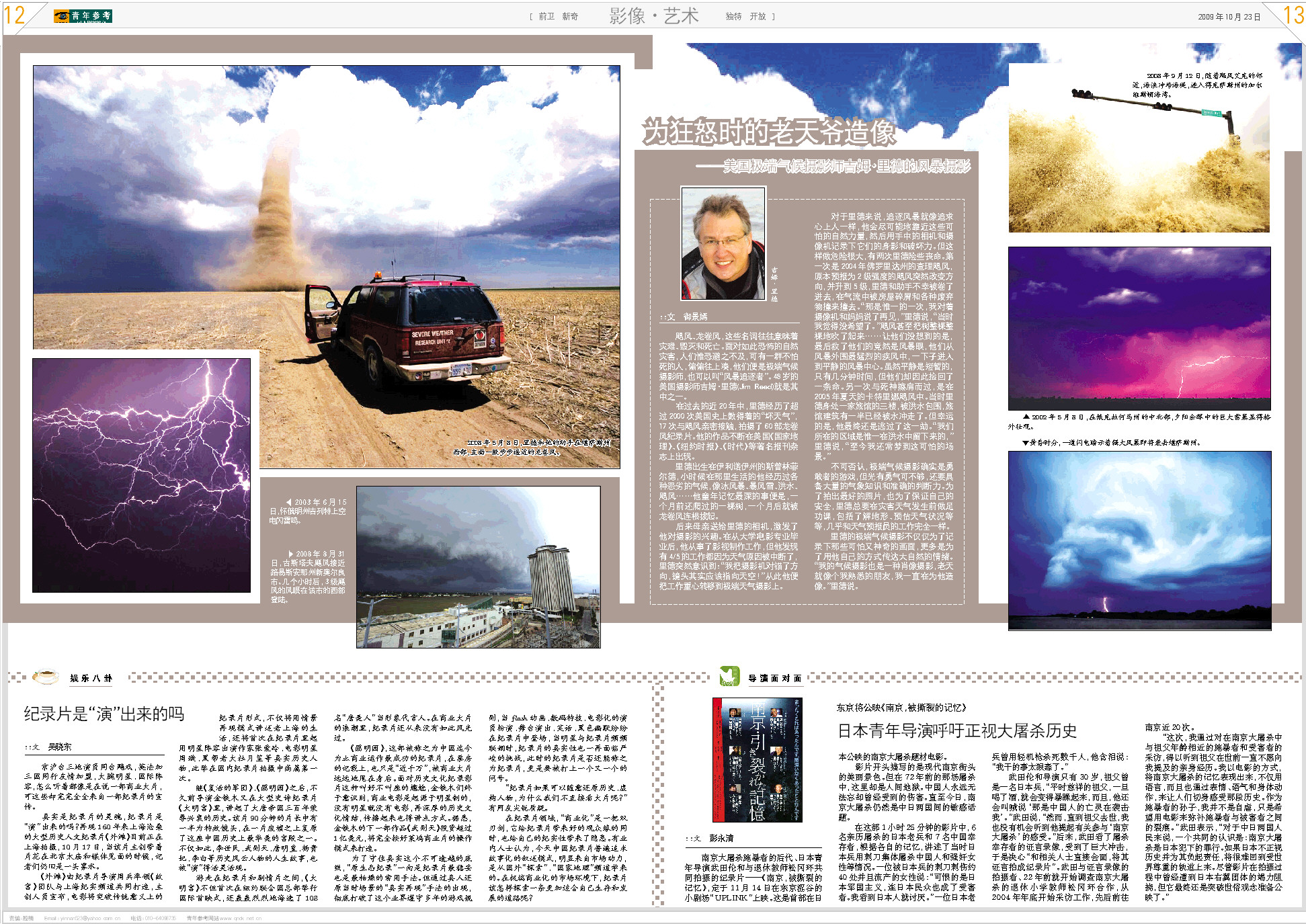 对于里德来说,追逐风暴就像追求心上人一样,他会尽可能地靠近这些可怕的自然力量,然后用手中的相机和摄像机记录下它们的身影和破坏力。但这样做危险很大,有两次里德险些丧命。第一次是2004年佛罗里达州的查理飓风,原本预报为2级强度的飓风突然改变方向,并升到5级,里德和助手不幸被卷了进去,在气流中被房屋碎屑和各种废弃物撞来撞去。“那是惟一的一次,我对着摄像机和妈妈说了再见,”里德说,“当时我觉得没希望了。”飓风甚至把树整棵整棵地吹了起来……让他们没想到的是,最后救了他们的竟然是风暴眼,他们从风暴外围最猛烈的疾风中,一下子进入到平静的风暴中心。虽然平静是短暂的,只有几分钟时间,但他们却因此捡回了一条命。另一次与死神擦肩而过,是在2005年夏天的卡特里娜飓风中。当时里德身处一家旅馆的三楼,被洪水包围,旅馆建筑有一半已经被水冲走了。但幸运的是,他最终还是逃过了这一劫。“我们所在的区域是惟一在洪水中留下来的,”里德说,“至今我还常梦到这可怕的场景。”