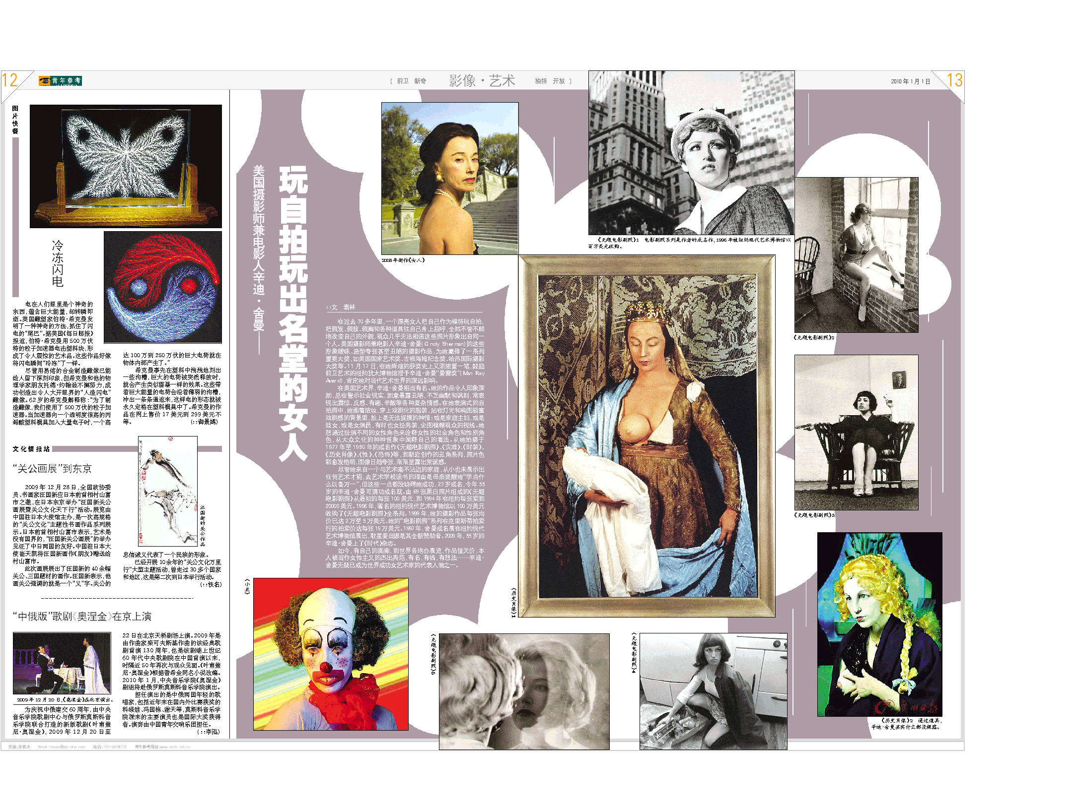在美国艺术界,辛迪·舍曼相当有名。她的作品令人印象深刻,总在警示社会现实,刻意暴露丑陋,不乏幽默和讽刺,常表现出震惊、反感、有趣、辛酸等各种复杂情感。在她表演式的自拍照中,她画着浓妆,穿上戏剧化的服装,站在灯光和构图极富戏剧感的背景里,脸上是无法捉摸的神情;或是家庭主妇,或是妓女,或是女演员,有时也女扮男装,企图模糊观众的视线。她想通过扮演不同的女性角色来诠释女性的社会角色和性别角色,从大众文化的种种怪象中阐释自己的看法。从她拍摄于1977年至1980年的成名作《无题电影剧照》、《灾难》、《时装》、《历史肖像》、《性》、《恐怖》等,到新近创作的丑角系列,照片色彩愈发艳丽,图像日趋夸张,渐渐显露出荒诞感。