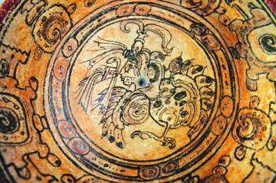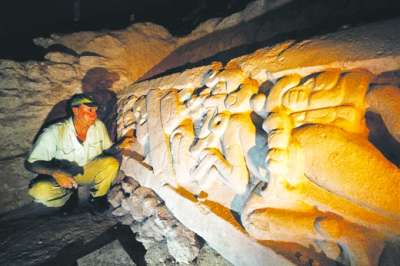 汉森带我们参观了迄今为止在埃尔·米拉多尔发现的最美丽、也最重要的艺术品——中央卫城檐壁。2009年,这两块26英尺长的灰泥板雕刻重见天日,上面的人物是玛雅传说里的双胞胎英雄乌纳普(Hunahpu)和斯巴兰克(Xbalanque)。两人是记载着神话、历史、传统习俗的圣书《波波武经》的主角。《波波武经》讲述了这对拥有超自然力的兄弟的救父冒险故事,他们的父亲在与地狱之神的球赛中输掉了脑袋。灰泥檐壁描绘的正是乌纳普带着父亲的脑袋游泳的情景。