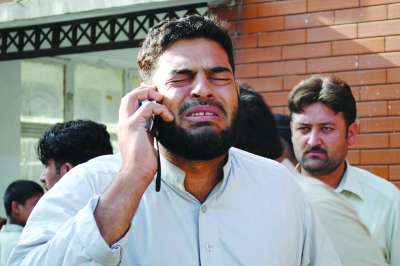 死别 当地时间5月13日,巴基斯坦西北部恰尔萨达地区一处边防军训练中心连接遭到2次自杀式炸弹袭击,目前已知造成至少78人死亡,30多人受伤。一名遇难人员亲属正通过电话传递噩耗。 |