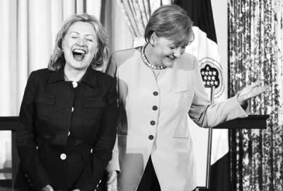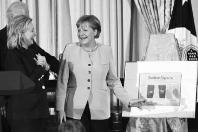 美国总统奥巴马7日以19响礼炮欢迎德国总理默克尔来访,两人都要求利比亚领导人卡扎菲下台。美国国务卿希拉里·克林顿7日在国务院午宴上盛赞默克尔为杰出领导人。默克尔则“投桃报李”,感谢希拉里的贡献,两人“英雌惜英雌”之情溢于言表。致辞最后,默克尔说她准备了一份礼物要给希拉里,自己还没讲完就忍俊不禁。而希拉里一看到礼物更是压不住自己招牌性的狂笑。原来默克尔准备的礼物是德国《法兰克福汇报》的一张剪报,该报纸刊登了一张希拉里今年4月访德时与默克尔会面的照片:照片上并没有出现两人的面部,只有两人双手垂放于身前的姿态。由于服式相似,手部姿势也相似,《法兰克福汇报》当时要读者猜一猜,“谁是默克尔?谁是克林顿?”欣赏到这个礼物后,希拉里站到默克尔身旁,摆出跟上次一样的姿势,全场顿时笑翻。