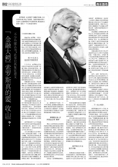 其中索罗斯对于中国的浓厚兴趣值得一提,据《华尔街日报》报道,索罗斯在香港设立的对冲基金公司在2010年11月8日正式开业。鉴于索罗斯过去在货币投机方面的成功,他来到亚洲注定会引起轩然大波。索罗斯2010年11月访华时曾对马云说:“我对投资中国比投资其他国家更感兴趣,我尤其对私人股权感兴趣,中国总的前景很好,许多实业里面会发生很多兼并,而资本市场能赚大钱的机会就来自于兼并和资产重组。”看起来,索罗斯的时代并未结束,他的下一站或许就是中国了,至于是否真的会如此,就让时间告诉我们答案吧。