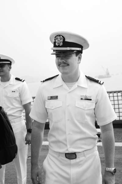 参观团一大早从港岛分域码头搭乘小型接驳艇,航行约一刻钟便看到了“康斯托克”号的巨大身影(图1)。登舰的同时,记者注意到,有大量身着便装的美军士兵正准备上岸游玩(图2)。在甲板上集合之后,来自舰上作战信息中心的约翰·爱尔兰中尉(图3)担任起解说员,为近40人的参观团队介绍了“康斯托克”号的相关情况。