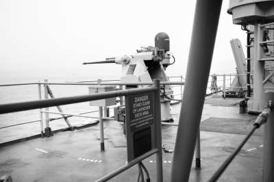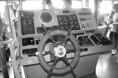 路过舷侧的25毫米舰炮旁(图7),记者好奇地想走近看一看、摸一摸,但立刻被陪同军官友好地制止了。在他的提醒下,记者才发现自己已踏入印有“危险”字样的区域,连忙退了出来。稍后,在舰船的核心区域——驾驶室内(图8),陪同军官也叮嘱参观者不要触碰各类设备。面对这么多“唾手可得”的宝贝,记者多少有点遗憾。