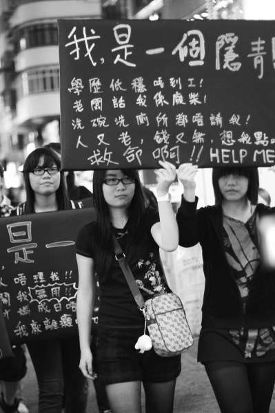 香港社会历来都有“穿黑衫,表意见”的民主表达传统,但是体现在一群中四学生(相当于内地高一、高二年级)身上,倒是极为少见。10月5日重阳节晚上8点30分左右,正逢旺角西洋菜步行街人潮涌动的高峰,这群以女生为主的“黑衫军”手持标语牌,高调出行。他们走走停停,高喊着“关注隐青,了解隐青,拯救隐青”的口号,言语虽然略显稚嫩,但分贝却足够坚决,还是吸引了大量匆忙路人来驻足倾听观看。