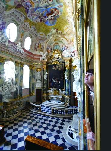 之前听人说过,迪特里希施泰因家族对攀龙附凤十分热衷。他们用巨大的房产巩固自身在上流社会中的地位,于城堡中庭张扬地展示用于斩首的巨剑,作为家族威权的象征。一幅表现婚礼的油画格外引人注目,那场婚礼由神圣罗马帝国皇帝马克西米利安一世主持,帮助这个家族于1515年步入贵族行列,也向外来者展示着往昔的光荣。当然,城堡里的珍宝绝不止这一幅画,另有数十幅真人大小的肖像挂在足有9英尺厚的墙上,画中人透过宽大的阳台俯瞰着山下城镇中那些赭色的农舍,以及散落其间的教堂尖顶。