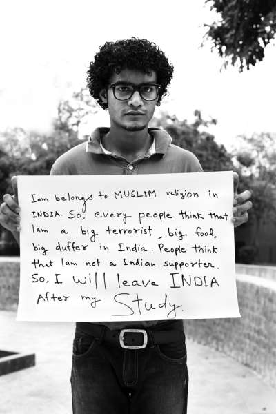 6.Nadeem Ahmad,20岁,穆斯林,来自新德里,数学学士。 “在印度,我是一名穆斯林信徒。所以,这里的每个人都认为我是一个大恐怖分子和大蠢货。人们认为我不爱自己的国家,所以,等我毕业以后我要离开印度。” |