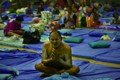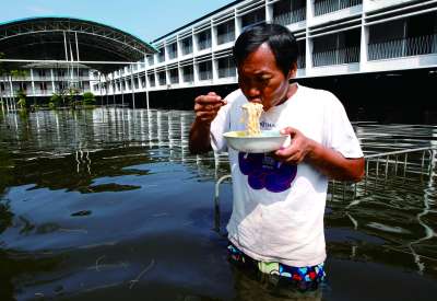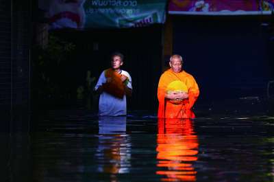 50年一遇的洪水淹过泰国。首都曼谷附近的临时安置点里越来越拥挤。随着曼谷的淹水面积扩大至27个区,更多居民带上财物搬进临时安置点生活。僧人在拥挤的安置点内诵经,而灾民们在一旁祈祷。虽然担心带不走的财物留在家里是否安全,但生命得到保障的灾民多数还是心存乐观。“这也担心,那也担心,那还不如死了算了。现在有吃有住,已经很不错了。”有灾民打趣说。