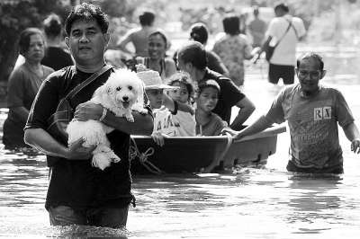 曼谷东部及湄南河沿岸部分地区受灾最为严重,大批生活在这里的民众被紧急疏散。有人划小船带着家当离开,有人把塑料浴盆和轮胎当作“交通工具”,甚至还有人把油桶和厚木板钉在一起,权当是条小船。志愿者和当地保安组成了专门的救援队,他们负责优先把老人、妇女和儿童转移到安全地带。