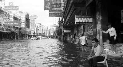位于曼谷市区西部的唐人街,曾是该市最繁华的商业区之一,但现在,也受到了洪水侵袭。在大多数当地居民出城逃难之后,唐人街上灯光昏暗,显得冷清了不少。虽然当地街道已被水淹数日,但几天来只要河水退潮,唐人街的积水就能迅速通过地下排水系统流进湄南河中。经过几日的潮涨潮落,唐人街留守居民已能从容应对,甚至还在水中取乐。