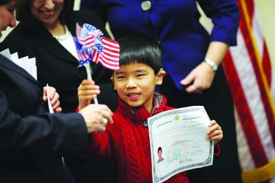 出生在中国的6岁男孩扎克利·希尔兹接过自己的国籍证明和小国旗。 |