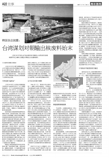 上世纪90年代中国与韩国建交后,心怀不满的台湾当局企图通过与朝鲜接近,给中韩关系打进一颗“钉子”。1997年,台湾谋划在朝鲜倾倒核废料,公布后在东北亚激起轩然大波,一度引起美国介入。最近,韩国《新东亚》杂志详细披露了此事的来龙去脉。