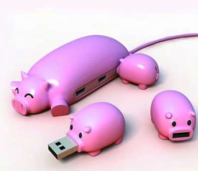 这是一组超级可爱的优盘组合,由一只母猪造型的集线器和三只小猪造型的优盘组成,使用起来别具一番乐趣。