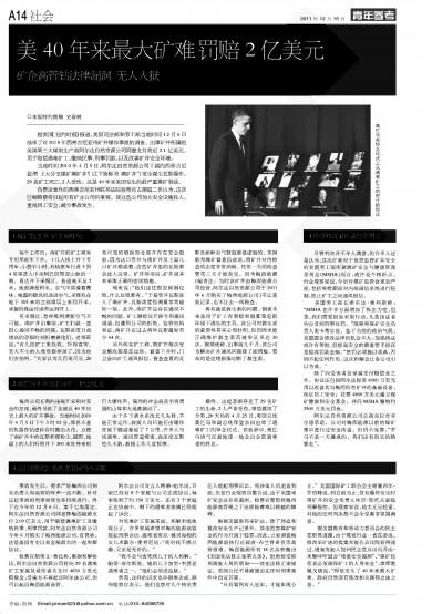 美国劳工部长希尔达·索利斯称:“MSHA在许多方面增加了执法力度,但是,我们需要国会采取行动,凡是违法者均应受到刑事处罚。”前联邦煤矿安全负责人麦卡蒂尔说,鉴于当前的政治气候,美国国会修改法律的机会不大。加强执法或许有帮助,但提高安全的最重要手段还是提高罚款金额。“惩罚必须施以重典,否则不起任何作用。这次和解会让各公司引以为戒。”