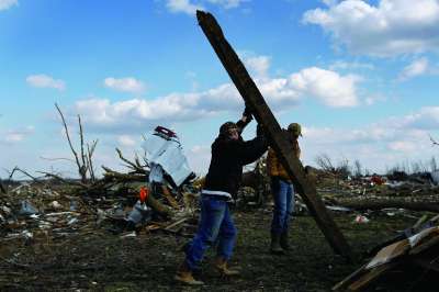 印第安纳州马里斯维尔的居民开始重建家园。在散落的废墟中,志愿者竖起一根被烧毁的房屋横梁。