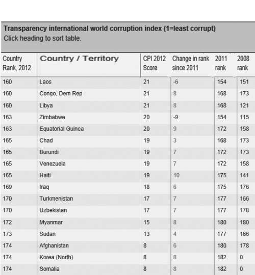 无怪乎拉贝勒主席感叹:“腐败猛于虎”。面对2012年的榜单,他只能说,“整个社会还在继续为腐败付出高昂的代价”。