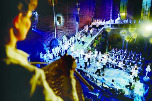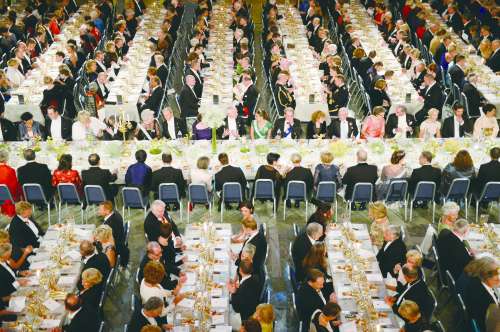据报道,诺贝尔晚宴厅内不仅要坐满1000多位来宾,还要留出缝隙供数百位服务员穿梭,因此被称为“世界上最拥挤的奢华晚宴”。餐桌上会摆放为纪念诺贝尔奖九十周年而制作的诺贝尔餐具,使用7000件瓷器、10000件银器和5400个酒杯。