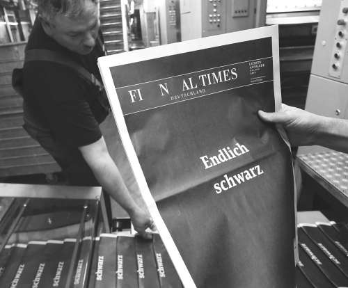 《德国金融时报》发行的最后一期厚达40页,头版全黑颜色,“终于完了”几个白字跃然纸上,透着悲凄。