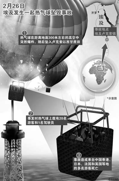 2月26日,在埃及南部旅游胜地卢克索,一个在300米高空飘浮的热气球着火爆炸后,坠落到甘蔗田中。