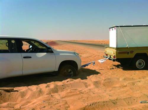 在阿曼开车倒不比露营容易。第二天,我们看见几处特别上镜的沙丘,不由自主地将车驶离铺装路面打算拍照。就这样,意外来了——刚离开路面6英尺,我们的车就陷进了沙子里动弹不得,此时我才意识到,在美国学习的旅游应急手册里没有“拖车”这一课。