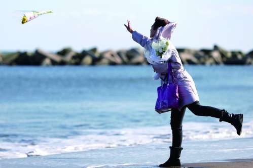 3月11日是“东日本大地震”发生两周年,日本政府在东京举行“3·11”大地震两周年追悼仪式。据日本政府部门统计,地震和海啸共造成15881人遇难、2668人失踪,至今仍有31万余灾民在各地避难。图为日本宫城县民众悼念地震亡者时,一女子将鲜花掷入海中祭奠亡人。