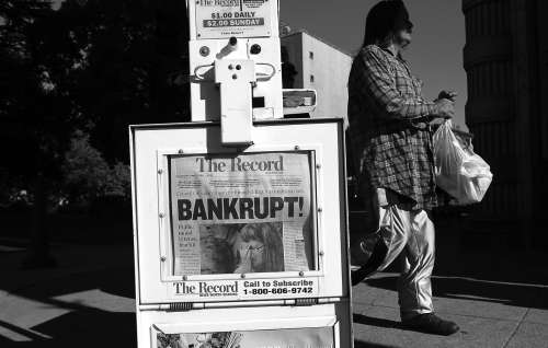 斯托克顿市居民从写着“破产!”字样的报纸前走过。 |