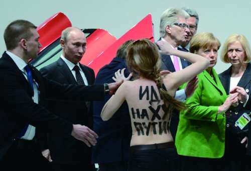 4月8日,当俄罗斯总统普京与德国总理默克尔在汉诺威工业博览会参观时,乌克兰女权组织“Femen”的数名女子突然冲破警戒线,来到两位领导人面前,脱去上衣,赤裸上身,并用英文高喊不文明口号。面对这份有些尴尬的“政治艳遇”,普京却在事后声明,这些积极分子赤裸上身高喊口号的活动博得了他的喜欢,但讨论政治问题最好还是穿上衣服。