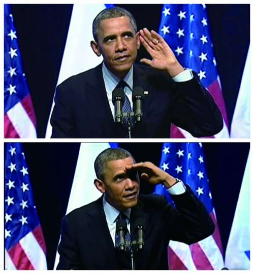 奥巴马上月在以色列演讲时遭抗议,他先作倾听状(上),又故作观望状(下),用幽默巧妙化解了尴尬。(图为视频截图) |