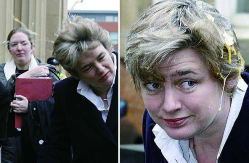 2006年2月,在参加完一场听审会后,英国教育部长鲁思·凯莉被抗议者的鸡蛋击中。 |