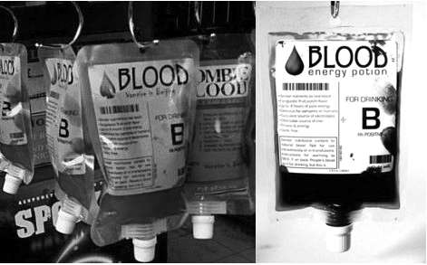 吸血鬼饮料——美国影视剧《暮光之城》、《吸血鬼日记》的热播,让崇尚个性的年轻人疯狂迷恋上了吸血鬼神奇的力量,他们甚至制造了一种特殊的饮料,其外形与医院用的血浆袋十分相似,被称为“吸血鬼饮料”。