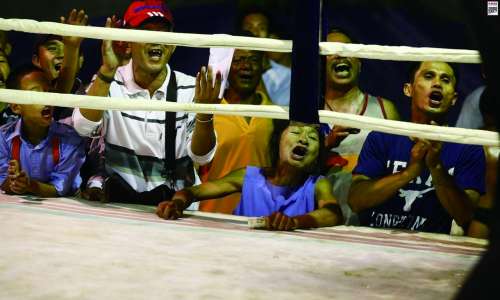 观众很兴奋,因为他们在小拳手身上下了注 |