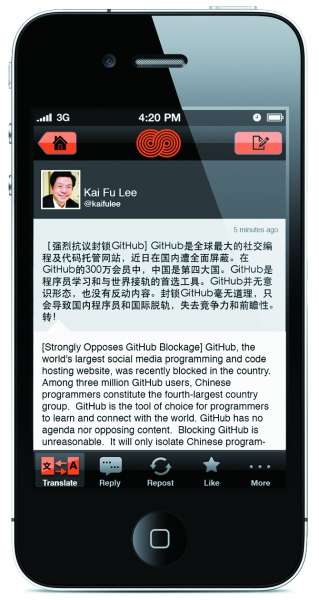 该软件的联合创始人杰弗里·布罗尔就是一个只能讲出5句中文的老外。他说:“最初的灵感来自于我个人的挫败经历,我已经和中国大陆接触10余年了,在这里有许许多多有趣的人我想要关注,但我却不能,因为我无法理解这个全新的世界。”