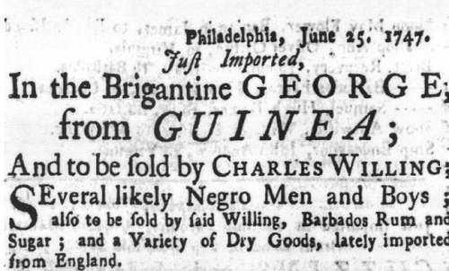 这则1747年的广告显示,宾夕法尼亚大学的一位董事曾参与奴隶买卖。 |