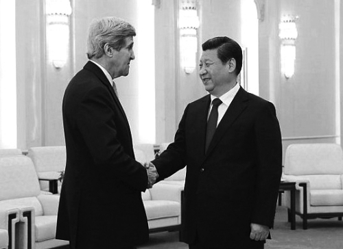2月14日,中国国家主席习近平(右)在北京人民大会堂会见美国国务卿约翰·克里。 |