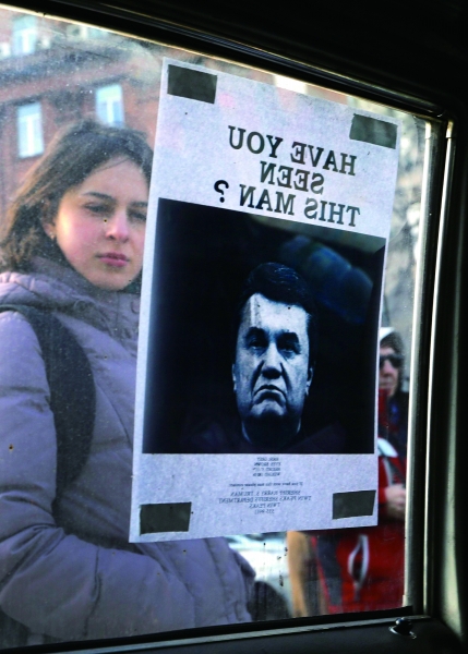 当地时间2月24日,乌克兰基辅独立广场的一辆车上贴着亚努科维奇的“通缉令”。乌克兰代理内务部长阿瓦科夫当天说,被议会解除总统职务的亚努科维奇已被警方通缉。据报道,亚努科维奇2月21日从基辅离开,目前去向不明。