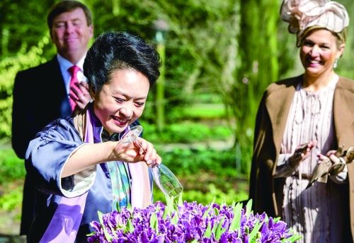 3月23日,荷兰利瑟,中国国家主席习近平和夫人彭丽媛在国王夫妇陪同下,参观中荷农业合作和荷兰郁金香花展。彭丽媛应邀将新培育的郁金香命名为“国泰”,并按当地传统浇上香槟。 |
