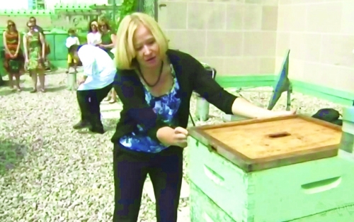(电视截图)7月27日,在多伦多的范尔蒙特皇家约克酒店的屋顶上,加拿大总理夫人劳琳,从容盖上蜂箱的盖子。她身后即为抱头鼠窜的酒店行政总厨桑顿。 |