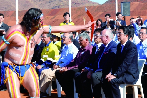 2014年7月9日,澳大利亚皮尔布拉,日本首相安倍晋三在澳大利亚总理阿博特及西澳大利亚州州长科林·班内特的陪同下参观了力拓西安吉拉斯铁矿,并观赏土著人跳舞。 |
