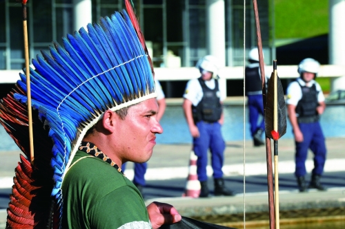 2014年5月28日,巴西首都巴西利亚,不同民族的土著居民在总统府前示威,抗议土地遭侵犯。 |