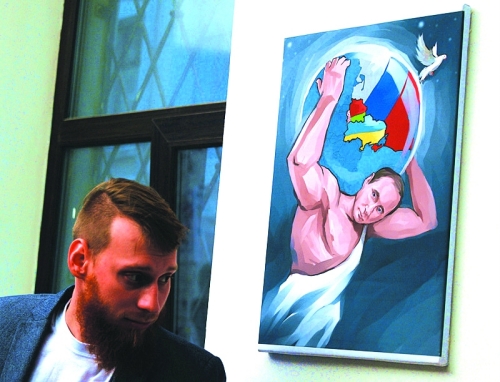 当地时间10月6日,俄罗斯莫斯科,当地举办普京画像展览,为其庆祝62岁生日。图为一名游客参观名为“劳工普京”的画展,画像中,普京变身“劳工”。
