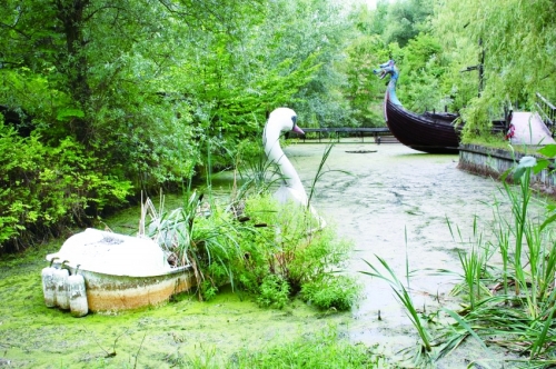 “猛犸象”一夜间消失,“海盗船”早已搁浅,覆满涂鸦的恐龙雕塑无力地横卧在地上,露出森森白牙,被杂草掩盖的游船散落在灌木从中,里面堆满沙土,模仿都铎风格的英式建筑群被火烧焦,“牛仔小屋”更是只余瓦砾,犹如一具骷髅。