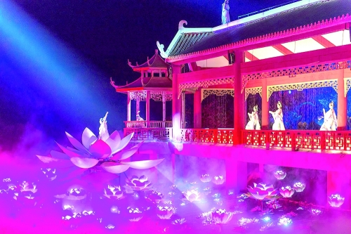 龙虎山是道教祖庭,《寻梦龙虎山》的主题也紧扣宗教元素,从一开始的民俗村到泸溪河畔的桃花州,待最后登上游船来到仙人城,多个场景顺序切换。