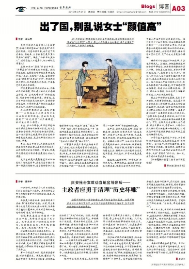 在中国,虽然大家现在对“颜值”念兹在兹,还没形成西方式的“政治正确”,不过平心而论,数十年前,尤其是改革开放前,并没有现在这种社会气氛。在革命的旗帜下,妇女的性别色彩其实是被抹去的,梳妆打扮、描眉粉黛都是禁忌。再往前推,祖宗留下的传统伦理也认为,动辄对人的外表评头论足是不尊重、不礼貌的,不管对方是男是女。
