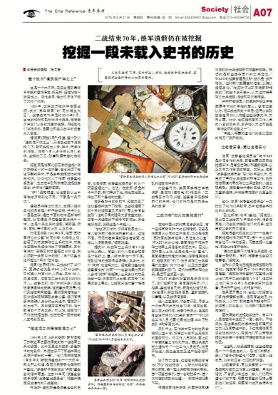 德国《世界报》称,二战共打了2077天,更确切地说是49842小时16分钟。平均每小时有1000人死去,其中100人来自德军。德军在二战中共阵亡约500万人。战争之初,他们中的许多人还能被像模像样地安葬,但随着战局发展,他们只能被草草掩埋。虽然后来有相当一部分遗体被移葬到战争公墓,但仍有很多未被确认身份的士兵遗体,埋在欧洲的土地下。其中埋在德国地下的,估计就有数十万具之多。可以说,绍克他们不仅在挖掘遗骸,也在挖掘一段未能载入史书的历史。