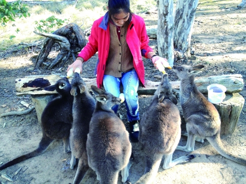我负责把它们搬到外面去,然后放出来,把袋子里的便便倒出来,换上干爽的袋子和尿布,然后把它们装回去。另一名志愿者负责冲奶粉,给它们喂饭,一天三次。早晚还要把小袋鼠放出来遛遛,让它们活动活动,和其他袋鼠交流交流。