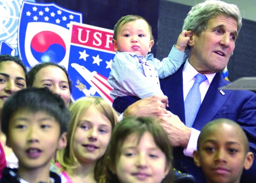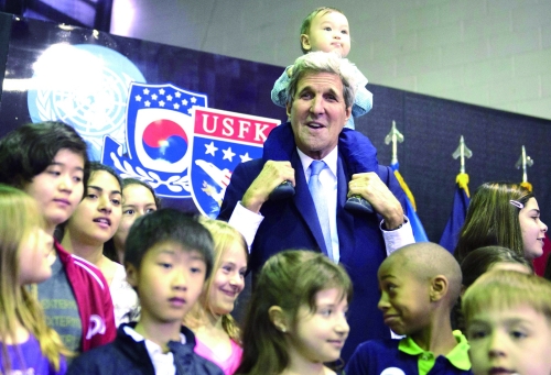 5月18日,韩国首尔,美国国务卿克里探访龙山基地,并对驻韩美军发表讲话。在与美军士兵子女合影时,克里将8个月大的Andrew Belz驾到自己脖子上,但在这过程中,他却惨遭小家伙揪耳朵。
