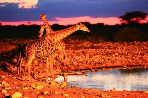 我们到达那天,当余晖浓抹、月牙升上树梢之时,小小的水塘边聚集了自然形成的分期、分批的长颈鹿、斑马、角马、大羚羊,还有珍贵的犀牛等饮水队伍。