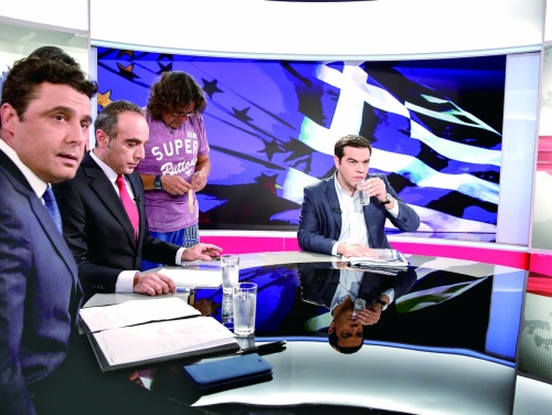 左图:当地时间2015年6月29日,希腊雅典,希腊总理齐普拉斯接受电视采访。他表示,7月5日的公投(就是否接受国际债权人以更多紧缩措施换取进一步援助的协议草案进行公投)目标是继续与债权人谈判,希腊民众对债权人提议的拒绝越强烈,对希腊就越有利。齐普拉斯认为,欧元区国家并无勇气将希腊踢出欧元区,因为那样代价巨大。