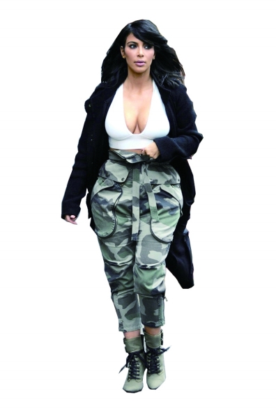 美国名媛金·卡戴珊以低胸短上衣搭配迷彩工装裤。 |